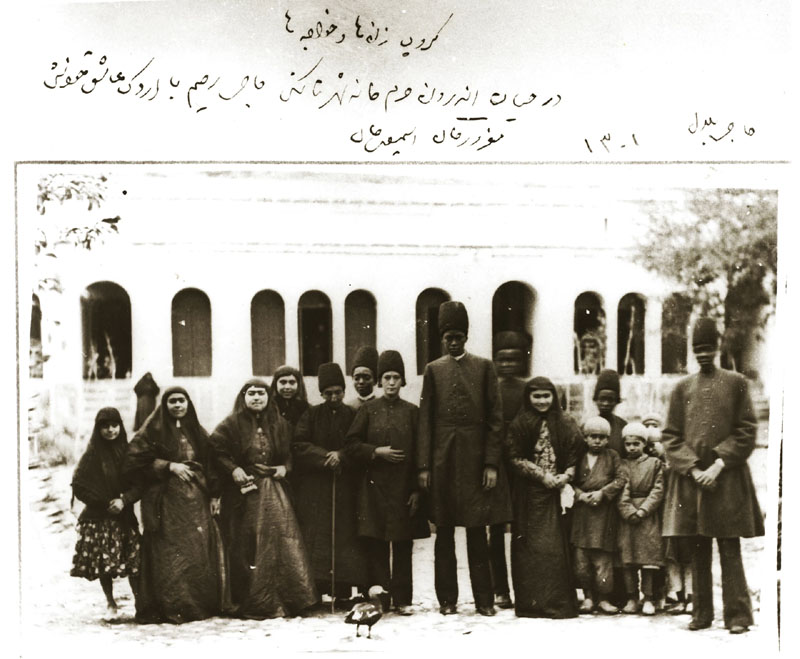 این عکس توسط شاه گرفته شده و یادداشتنویسی شده است. گروهی از زنان شاه و خواجگان داخل باغ حرمسرا در عکس نمایش داده میشوند، داخل مجموعهٔ کاخهای شمال تهران، شهرستانک. پنج بردهٔ آفریقایی در این عکس قرار دارند که دو نفر از آنها بزرگسال هستند و احتمالاً از اتیوپی آمدهاند و سه نفر دیگر نوجوان هستند: حاجی بلال (سمت راست)، اسماعیلخان (بردهٔ سفیدپوست نفر اول از سمت راست)، مغرورخان (بردهٔ آفریقایی نفر چهارم از سمت راست)، حاجی رحیم (بردهٔ سفیدپوست نفر دوم از سمت راست، رئیس بردگان حرمسرا) ۱۸۸۳.