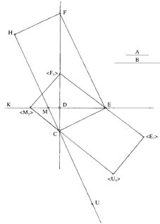 دو پاره خط عمود بر همِ DC و DE را در نظر میگیریم (شکل 1) به طوری که DC=A و DE=B. خطی که در E بر CE عمود شود، امتداد DC را در F قطع میکند و خطی که از نقطۀ C موازی با EF رسم شود، امتداد ED را در نقطۀ M قطع میکند. نقطۀ U را روی امتداد MC طوری انتخاب میکنیم که MU=EF. فرض میکنیم که دو خط MU و EF در عین حال که مقدار اصلی خود را حفظ میکنند، بدینصورت حرکت کنند: نقطۀ F روی DC به طرف D بلغزد؛ نقطۀ E ثابت بماند و خط EF حول آن بچرخد؛ در همان حال که MU با EF موازی میماند نقطۀ M، روی ED ، در جهت دور شدن از D، حرکت کند؛ و MU حول نقطۀ C بچرخد و این حرکت تا وقتی ادامه یابد که خطی که در E بر EF عمود میشود، خط MU را در نقطۀ U قطع کند. اگر دو پاره خط در این حالت در وضعهای F1E1 و M1U1 باشند. با استفاده از قضیۀ فیثاغورس در مثلثهای قائمالزاویۀ CM1F1 و M1F1E نتیجه میگیریم که: