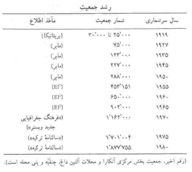 تا پیش از جنگ جهانی اول (1914- 1918 م) آنكارا شهر كوچكی بود و بنابر گزارشی در 1307 ق / 1890 م میان 25 تا 30 هزار نفر جمعیت داشت كه حدود یک چهارم آنان مسیحی بودند (İA, I / 445). آمار زیر آهنگ رشد سریع جمعیت آنكارا را در فاصلۀ سالهای 1919-1980 م نشان میدهد:درصد افزایش جمعیت، طبق سرشماری 1980 م 17 / 79 بوده است («سالنامۀ تركیه»، 37 / 43). در حال حاضر، آنكارا در میان شهرهای تركیه، از لحاظ كثرت جمعیت، پس از استانبول و پیش از ازمیر قرار دارد. تراكم جمعیت در بخشهای مركزی آنكارا در 1970 م حدود 424 نفر در كم2 بود درحالیكه در همان سال تراكم جمعیت در كل ایالت آنكارا در حدود 5 / 65 نفر بوده است (بریتانیكا، I / 926). تراكم جمعیت در محلات مختلف آنكارا نیز متفاوت است: در آلتین داغ 1901، در چنقیه 529، در ینی محله 244، ولی در ایاش 15، در بالا و نعللو خان 17 و در بك پازاری 21 نفر در كم2 است (YTA, II / 147). حدود دو سوم جمعیت كل ایالت آنكارا (689‘854‘2 نفر) در شهر آنكارا زندگی میكنند.